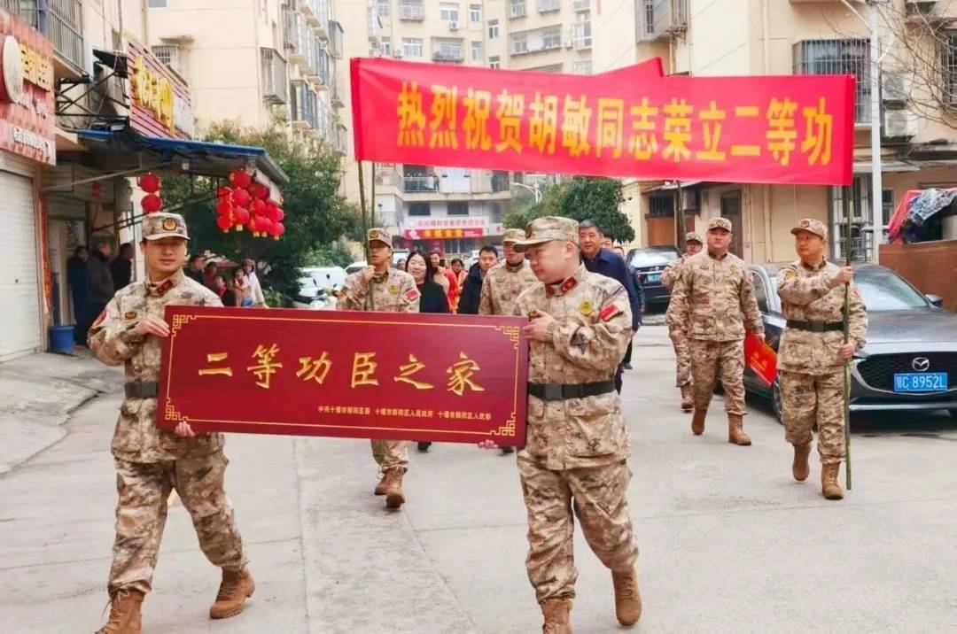 当天上午,十堰市郧阳区退役军人事务局、区人武部联合城关镇政府组成报喜队,敲锣打鼓,高举着“热烈祝贺胡敏同志荣立二等功”的红色横幅,在街坊邻居簇拥下,将承载着荣誉的喜报、慰问金和“二等功臣之家”荣誉牌匾郑重地送到胡敏家人手中。鲜红的绶带、热闹的鞭炮和热烈的氛围,为这个家庭再添一抹新年喜悦。