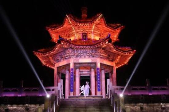 r4.天女散花:以“狐仙” 形象为视觉原型,借助威亚技术与光影效果,让演员身着古典服饰飞过演艺广场上空,漫天挥洒花瓣。节目将中式美学与现代科技深度融合,还原了传统文化的韵味,传递出“美育万物,善泽苍生” 的东方哲学。