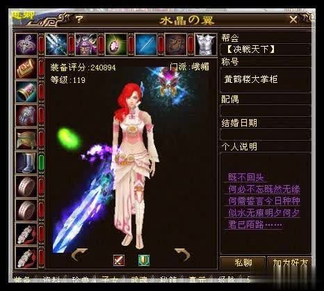 水晶の翼与其现实丈夫逍遥の翼,堪称骨灰级老玩家,在【鼓浪闻涛】服务器开区四天时便踏入天龙江湖。他们实力强劲,打造了两个6级号(一个6级丐帮,一个6级峨嵋),然而为人却极为低调。
